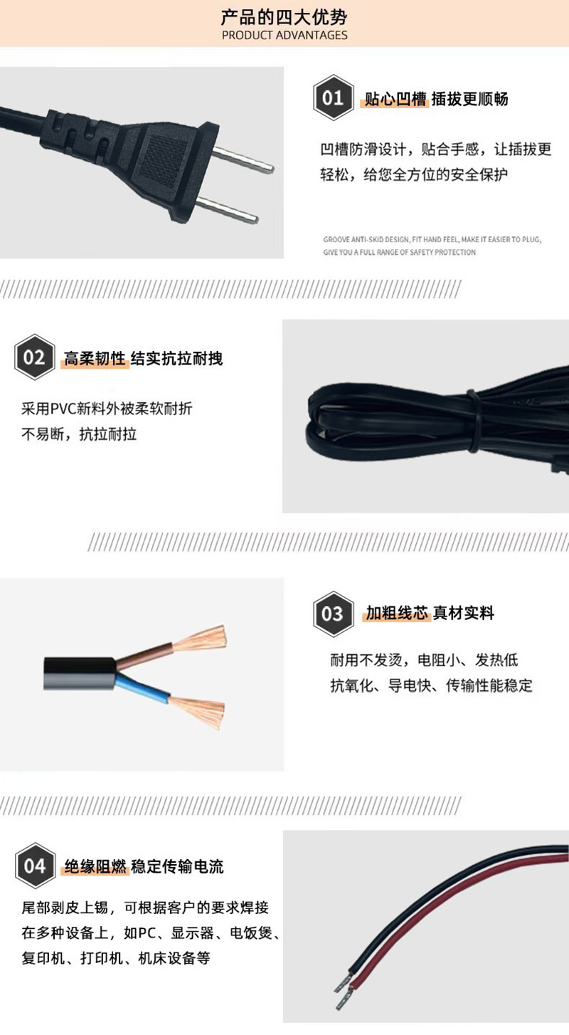 ac线 国标欧规美规英规ac插头电源线尾部上锡尾可带尾卡ac电源线