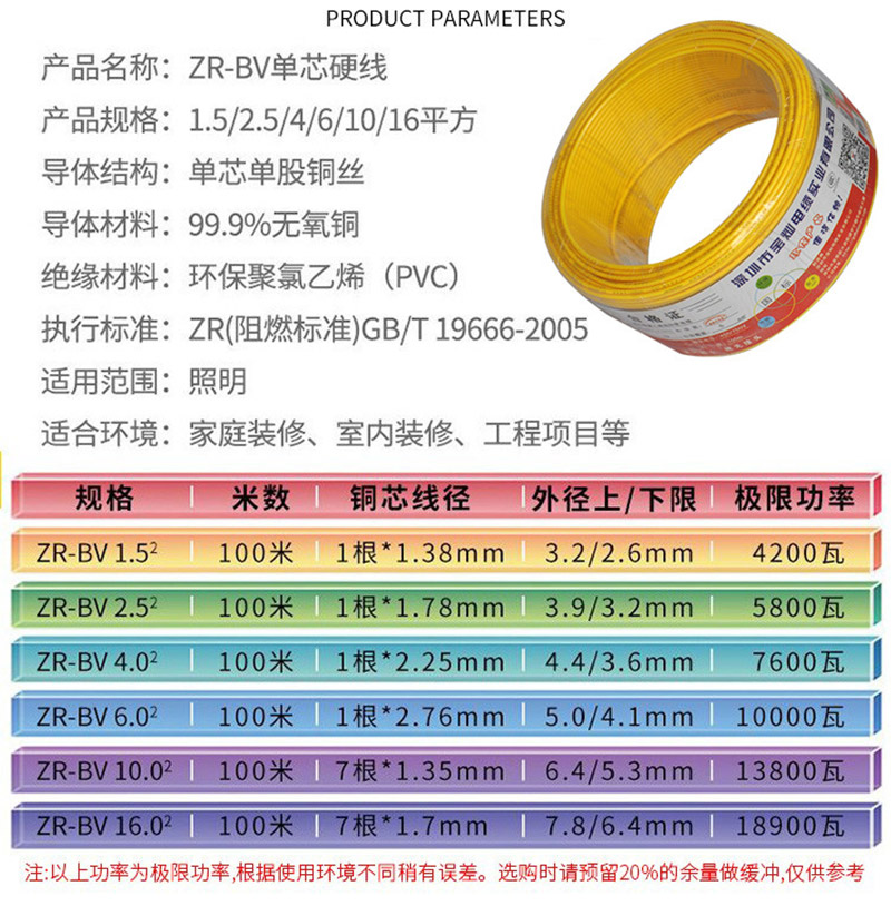 国标BV单芯电线家用装1 1.5 2.5 4 6平方纯铜芯电源线电缆多股硬